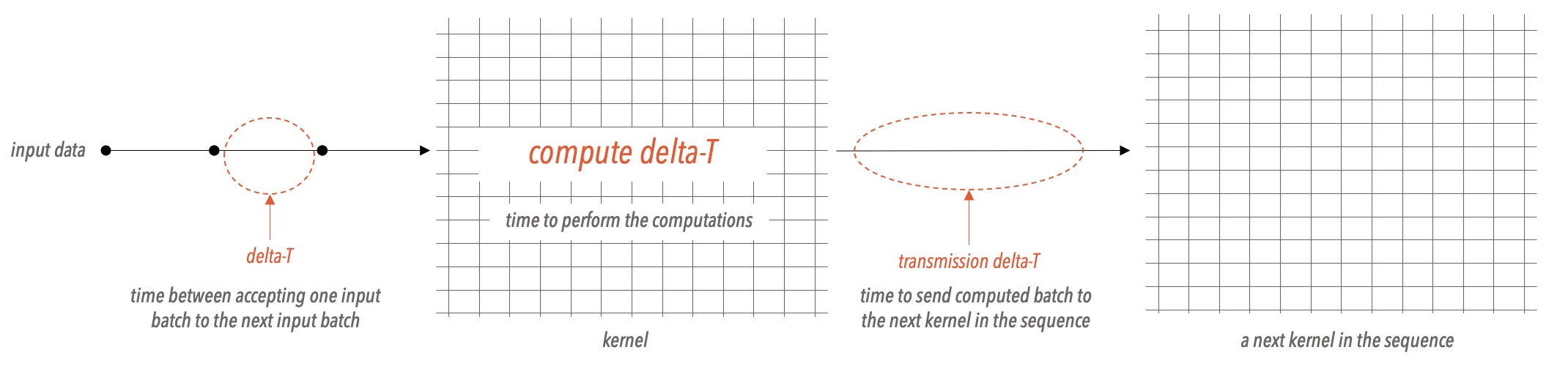 During the runtime, as the network undergoes training, it matters greatly how rapidly the successive input data can be streamed into a kernel. For the CS system, the duration of time required by the kernel between accepting two successive input batches is called delta-T, expressed in cycles.