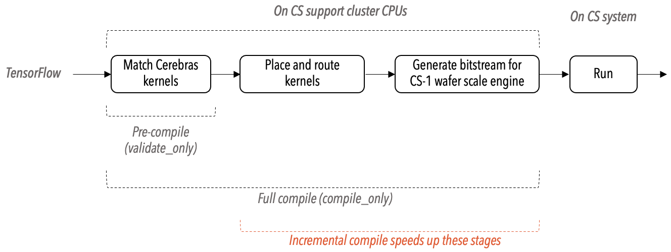When a TensorFlow program containing CerebrasEstimator is compiled using the Cerebras Graph Compiler (CGC), the CGC executes a sequence of transformations on this program. During this process, the compiler performs a series of optimizations that will translate the neural network described in the TensorFlow to an executable bitstream for the CS system.
